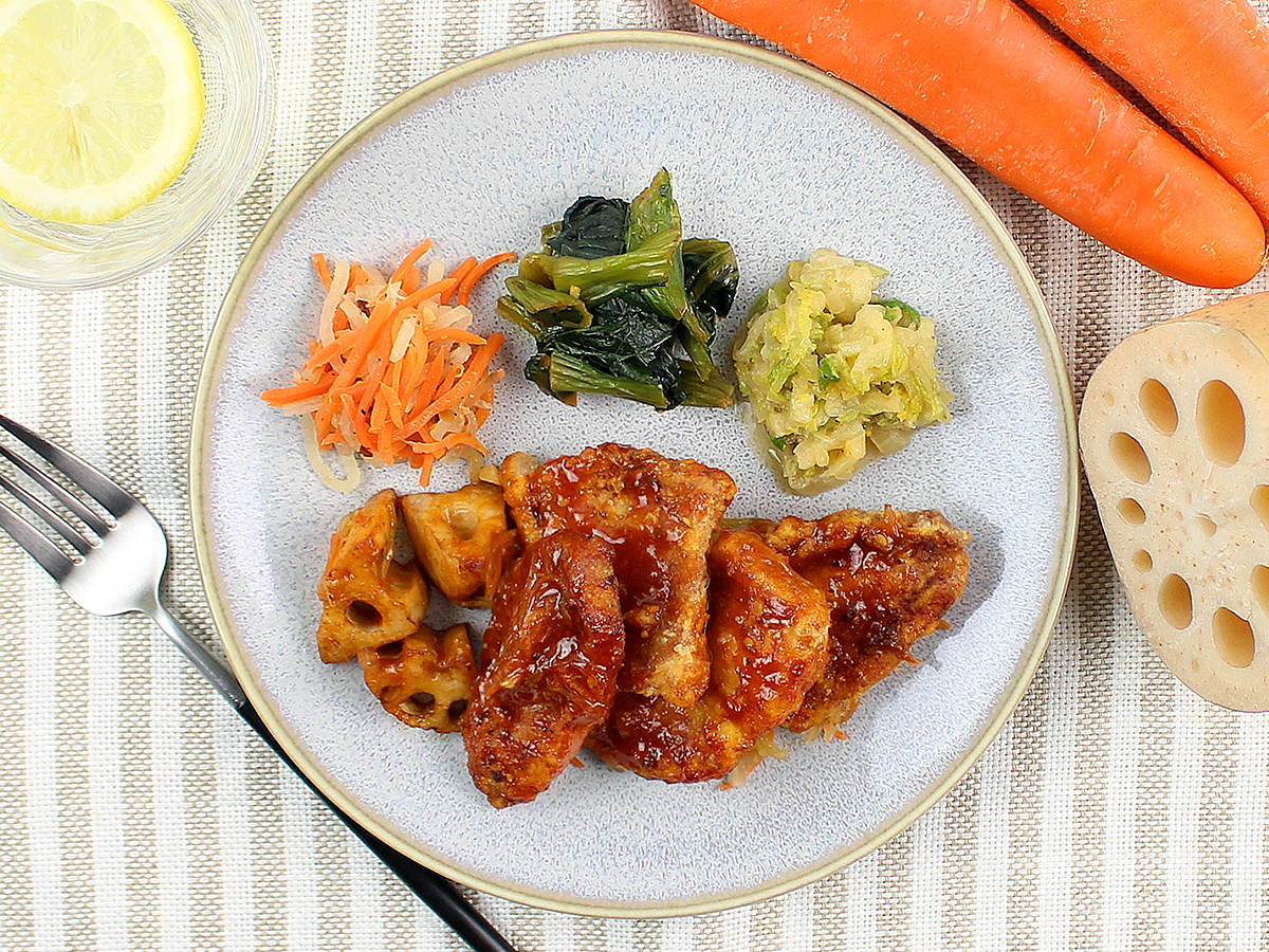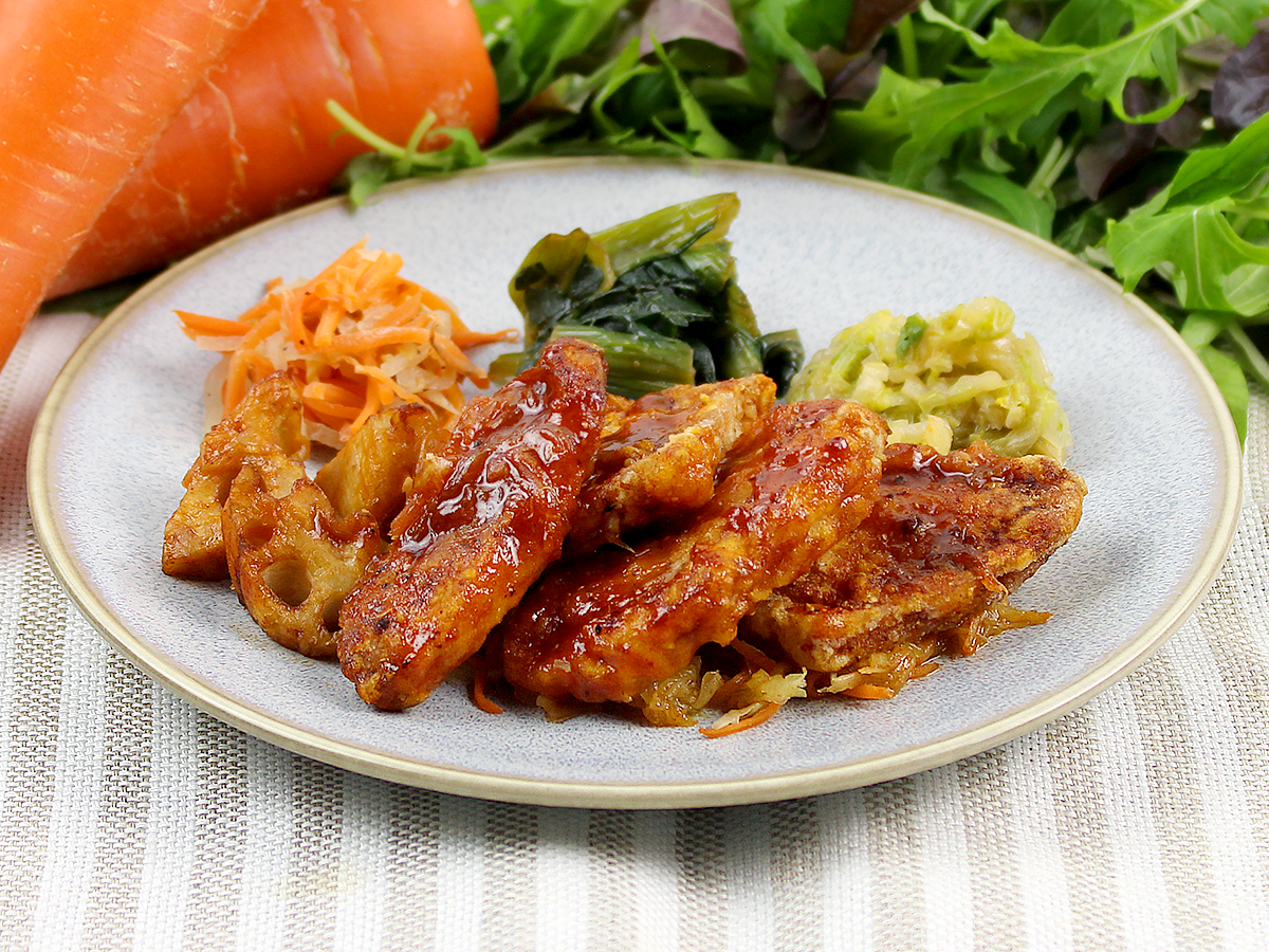 カラッとフライした豚ロースのから揚げを、4種のジャンと花椒の痺れる辛さが特徴のソースでお召し上がりください。キャベツと人参のコールスローを敷き、シャキシャキ食感のレンコンフライを添えました。