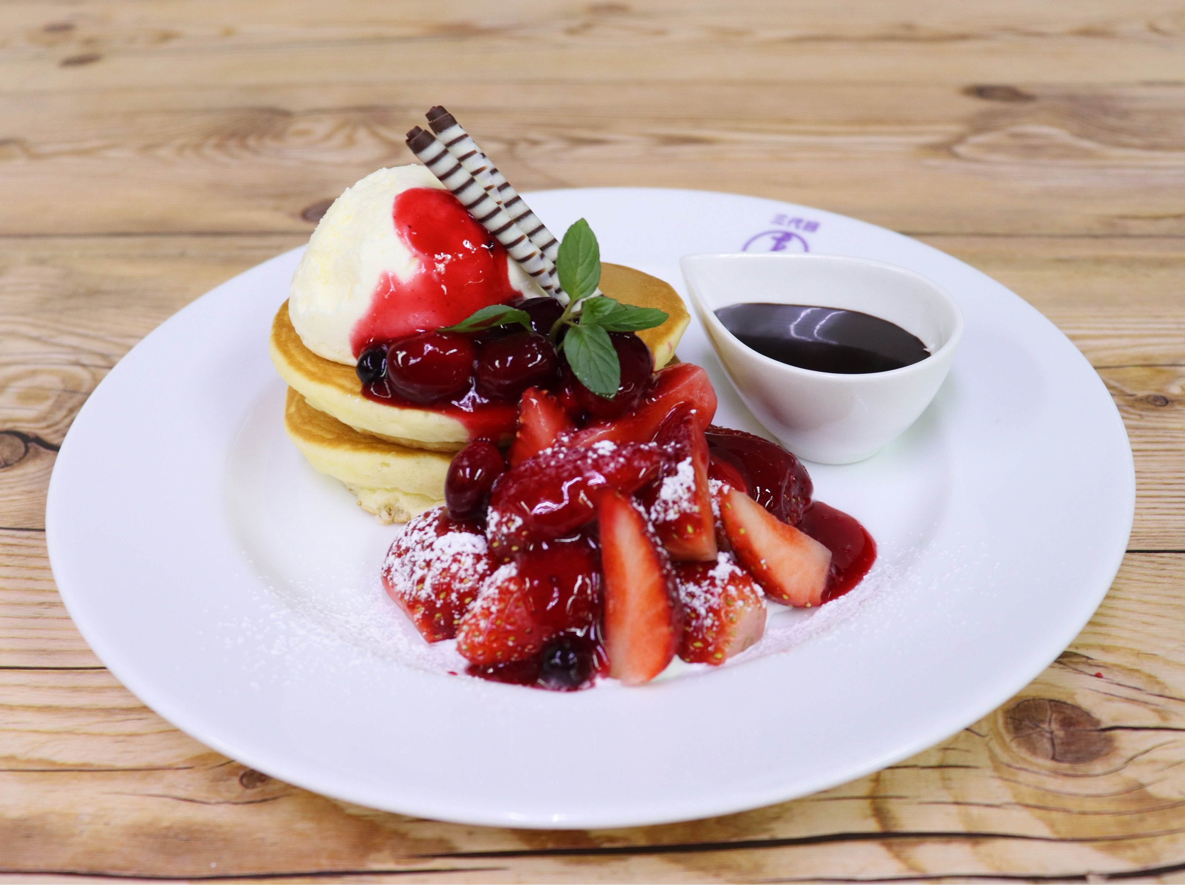 迎春にふさわしいとちおとめの苺とパンケーキとのコラボにチョコレートソースとストロベリーソースを加えた商品です。