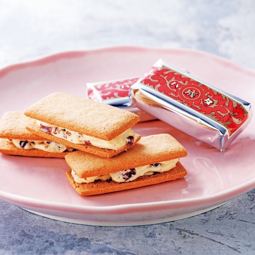 福井名物の羽二重餅とバタークリームをチーズクッキーでサンド。