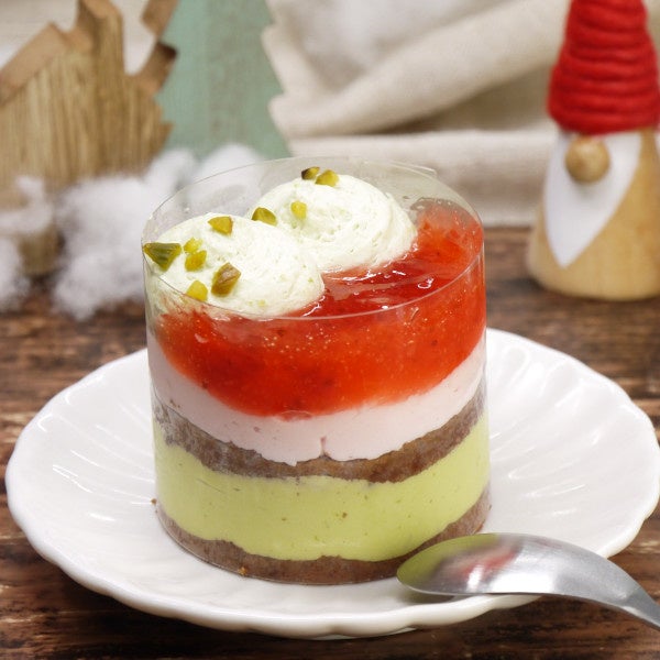 ほんのりビターなココアスポンジ生地に、ピスタチオムースとストロベリームースを重ね、苺果肉入りの真っ赤なジュレを流したクリスマスらしい色合いの5層仕立てのピスタチオケーキです。ローストしたピスタチオの奥深い味わいと、ほどよく酸味のある苺のムースとジュレが相性抜群のひと品です。