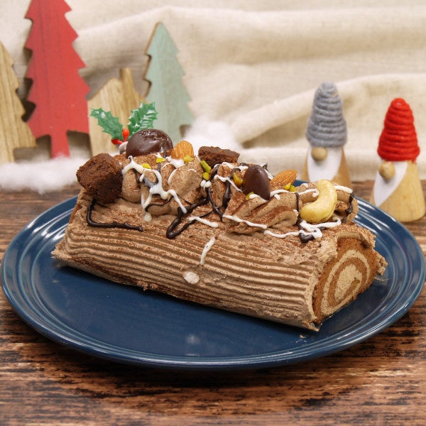 北海道産生クリームと3種のベルギーチョコをブレンドしたこだわりのベルギーチョコクリームを、ココア風味のふんわりと軽いロールケーキ生地で巻き上げました。2色のチョコソースが味のアクセントになり、チョコペレット、チョコブラウニー、アーモンド、カシューナッツ、ピスタチオやヒイラギの葉のトッピングで見た目も楽しく飾りました。