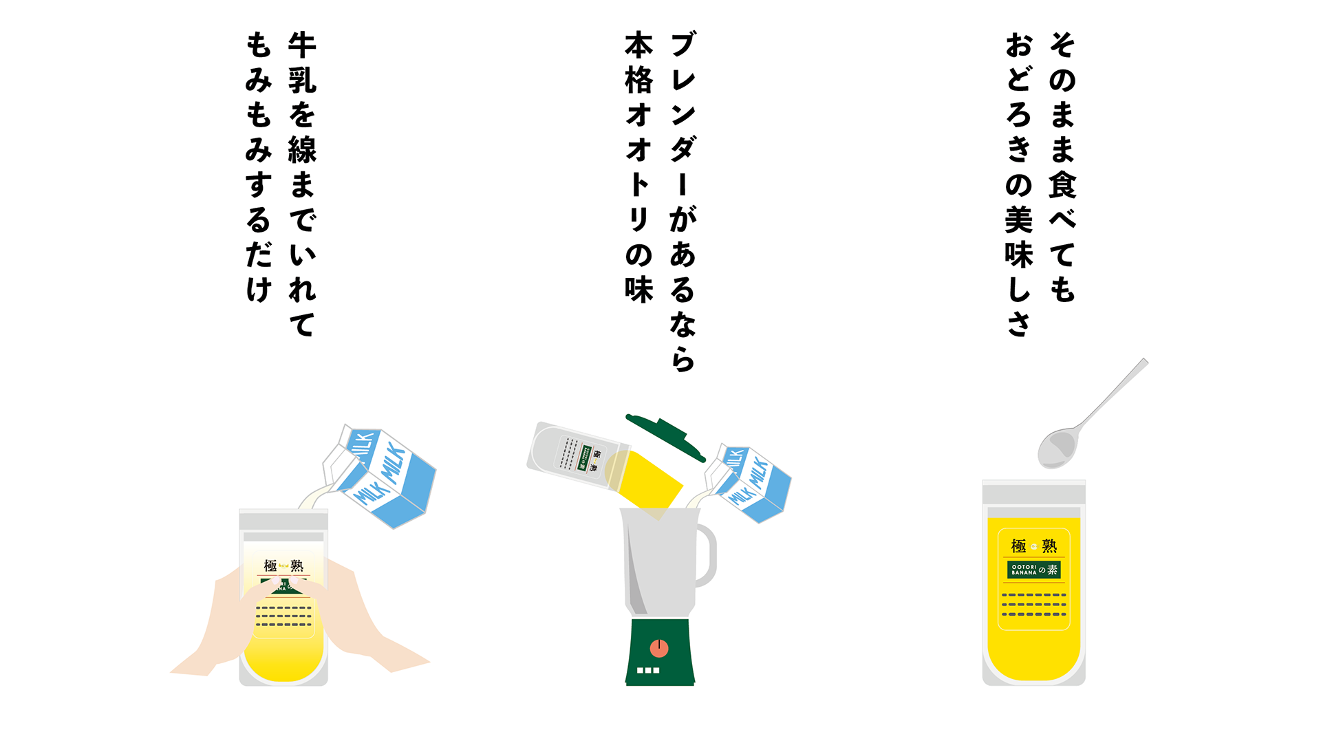 そこで『ご自宅でも手軽にお店のバナナジュースを飲んでもらいたい』をコンセプトに、お店で提供しているものと同じ状態のバナナをご自宅向けにアレンジした商品開発がスタート。ブレンダーを使わなくても手軽にバナナジュースが作れるようパッケージと形状にこだわり、ジュースとしてだけではなく、そのまま食べても美味しい【極熟★オオトリバナナの素】が生まれました。