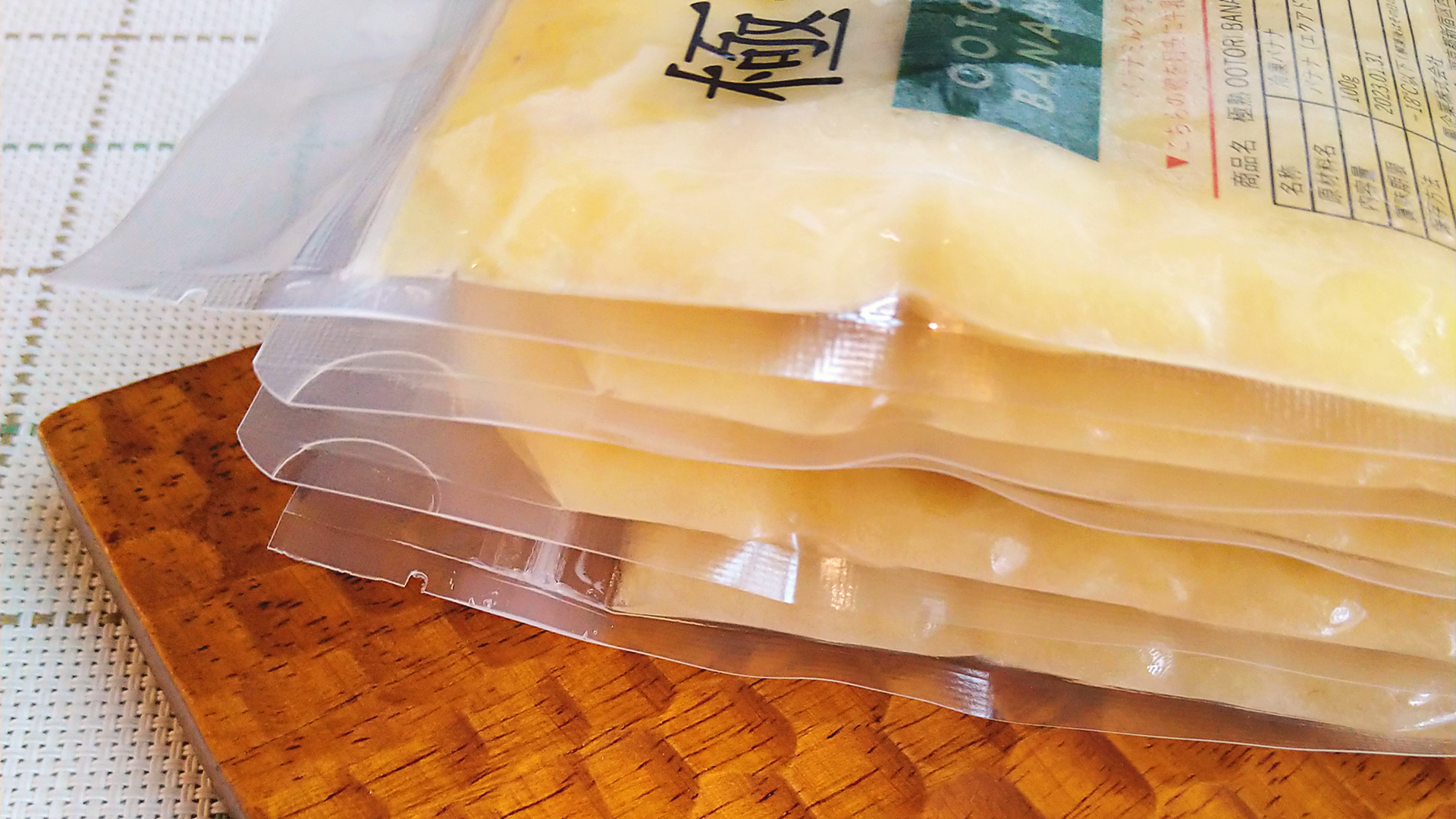 完全栄養食とも言われるバナナを、一定の温度に保たれた専用熟成室にてしっかりと管理・熟成。添加物は一切加えず、バナナのみを独自の製法で加工・冷凍することにより、砂糖不使用なのに驚きの甘さを実現しました。使いやすさを考え100g(バナナ1本相当)ずつ小分けにされた商品は、薄い板状なので冷凍庫でかさばらず常備食としてもオススメです。冷凍保管することにより、状態変化が早く管理が難しいバナナを「いつでも いちばん おいしいまま」ご自宅で手軽にお召し上がりいただけます。