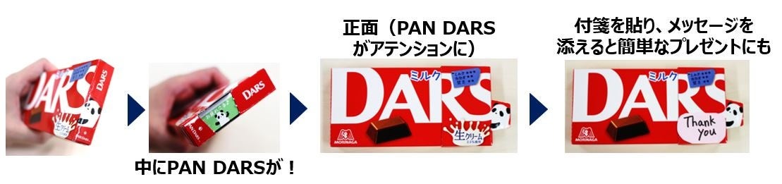 「白いダースプレミアム<レーズンバターサンド味>」、「ダースプレミアム<キャラメルガナッシュ仕立て>」「ダース<ミルク>」、「ダース<甘さ控えめミルク>」、「白いダース」5商品のパッケージの側面に、 PAN DARSが描かれ、切り取り線部分を開けると、PAN DARSから「お疲れさま」「ありがとう」などの癒しのメッセージをお楽しみいただけます。さらに正面から見ると、開けた部分のPAN DARSがつぶやいているように付箋などでメッセージを貼ることもでき、簡単なプレゼントとしてもお渡しいただけます。
