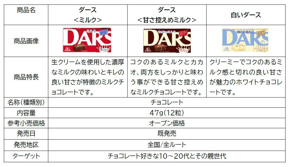 「白いダースプレミアム<レーズンバターサンド味>」は、レーズンバターサンドの味わいを表現し、全粒粉ビスケット、ラングドシャ、厳選したレーズンを練りこみ、開けた瞬間から溢れ出るバターの香りをお楽しみいただけるプレミアムなホワイトチョコレートです。「ダースプレミアム<キャラメルガナッシュ仕立て>」は、隠し味にキルシュ(ブランデー)を使用し、柔らかい口どけで、濃厚なキャラメルの香りを楽しめるキャラメルガナッシュ仕立てのチョコレートです。