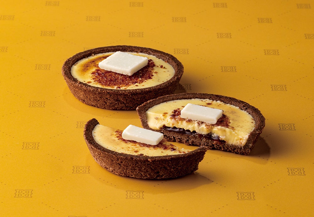 パリン、サクッ、とろりの三重奏をお楽しみください。バニラ香るクリームをパリンとブリュレした、サクッと香ばしいショコラ風味のバタータルト生地。中からとろりとあふれ出すショコラキャラメルソースが、おいしさのひと工夫。四角いバターショコラのコクも浮かべたバレンタインの“ごほうびタルト”です。