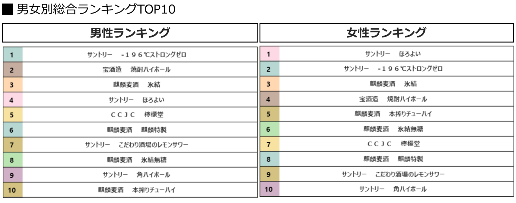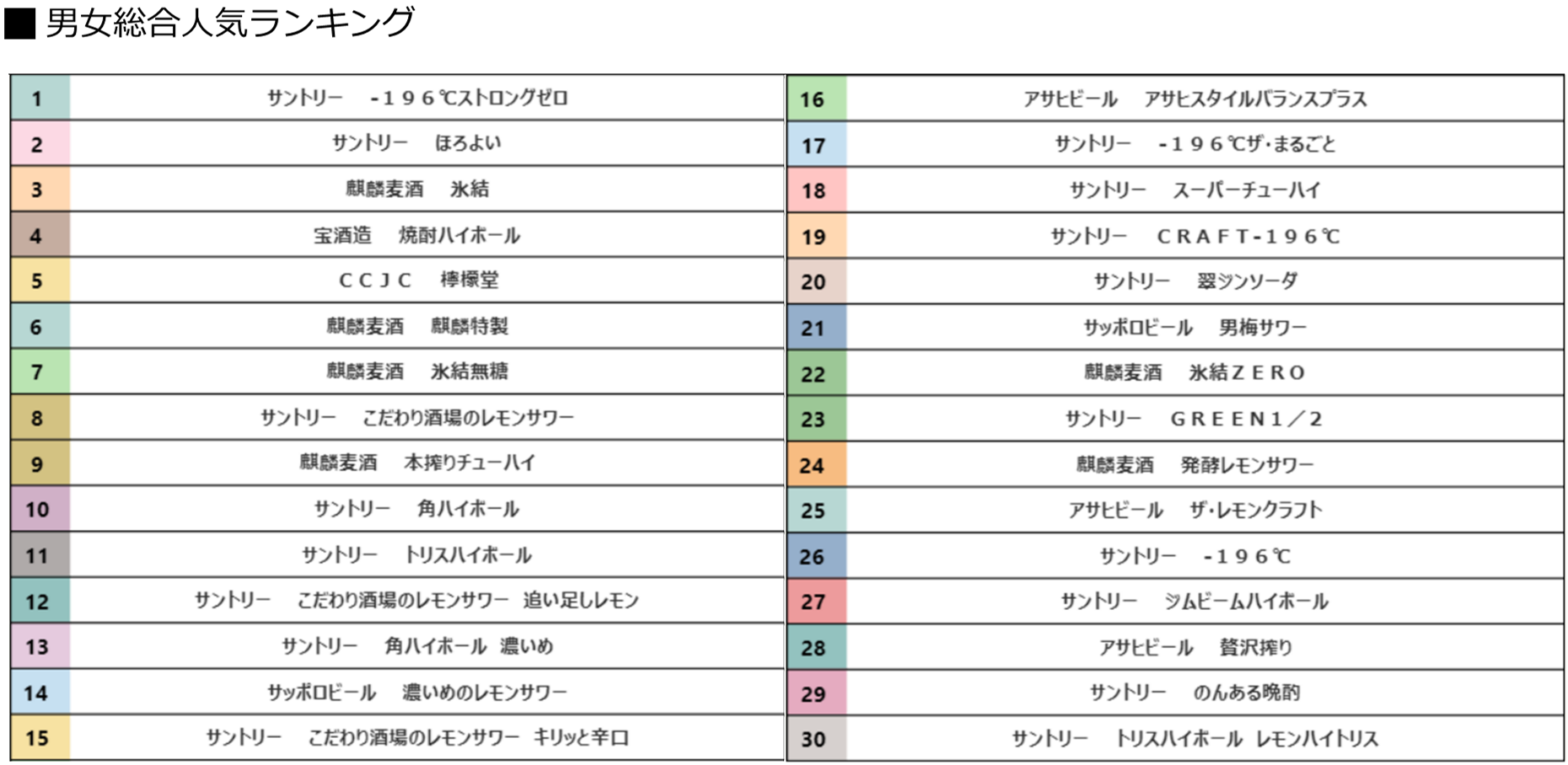 - 男性1位はサントリー「-196℃ストロングゼロ」、女性1位はサントリー「ほろよい」
