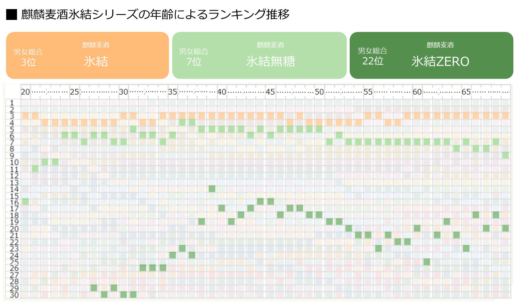 麒麟麦酒の「氷結」シリーズについて、3位「氷結」と、7位「氷結無糖」、22位「氷結ZERO」を比較しました。ノーマルの「氷結」は、全年齢で3、4位とランキング上位を維持しており、定番の商品として全年齢で人気のようです。無糖・甘くない味わいが特徴の「氷結無糖」は、20代にかけてランキングが上昇し、36歳で4位にランクインしました。一方糖類・プリン体ゼロの「氷結ZERO」は、30代にかけて上昇し、39歳で14位にランクインしています。どちらも糖類を含まない商品ですが、ターゲットが異なるため、「氷結無糖」は自宅で食事と飲酒が増える20代にかけて、「氷結ZERO」は健康意識が高まる30代にかけてランキングが上昇しているのかもしれません。