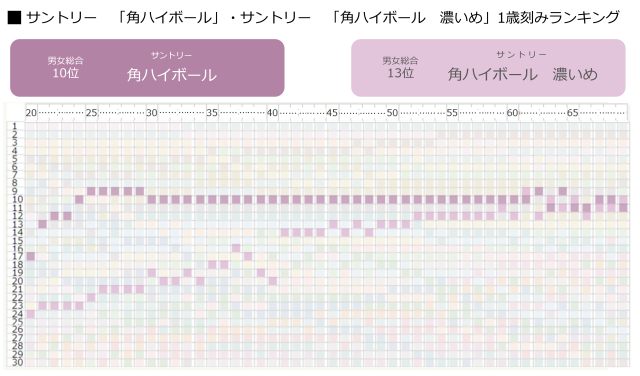 ハイボールの中で10位のサントリー「角ハイボール」と13位のサントリー「角ハイボール 濃いめ」を比較しました。度数7%の「角ハイボール」は、25歳の9位以降ランキングを維持しており、9%の「角ハイボール 濃いめ」は20歳で24位ですが、年齢とともにランキングが上昇し、61歳では9位にランクインしています。アルコール度数が高いブランドは高年齢層に人気なのかもしれません。