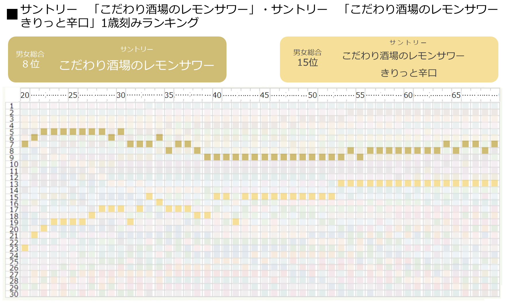 続いて、レモンサワーの中でも8位のサントリー「こだわり酒場のレモンサワー」と、15位のサントリー「こだわり酒場のレモンサワー キリッと辛口」を比較しました。度数7%の「こだわり酒場のレモンサワー」は、22~28歳の5位以降で若干ランキングは下がるものの、10位以内を維持しています。一方、9%の「こだわり酒場のレモンサワー キリッと辛口」は年齢とともにランキングが上昇し、53歳以降は13位にランクインしていました。