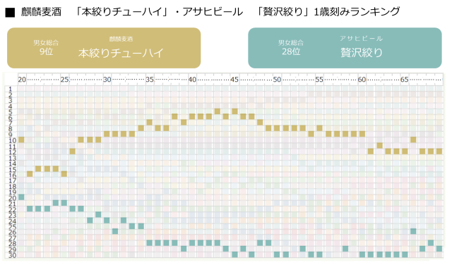 麒麟麦酒「本搾りチューハイ」は30代にかけてランキングが上昇し、43歳で5位にランクインしました。一方、アサヒビール「贅沢搾り」は20歳の20位をピークに、年齢とともにランキングが下降しています。2ブランドの違いを比べてみると、本搾りチューハイは度数6%で、香料・酸味料・糖類無添加になっており、甘さを控えてヘルシーさを押し出した商品なので、年齢が上がるとともに健康が気になる方に人気のようです。「贅沢搾り」は度数4%と、低アルコールでフルーツ感が強く、飲みやすいものを好む若年層に人気が高いのかもしれません。