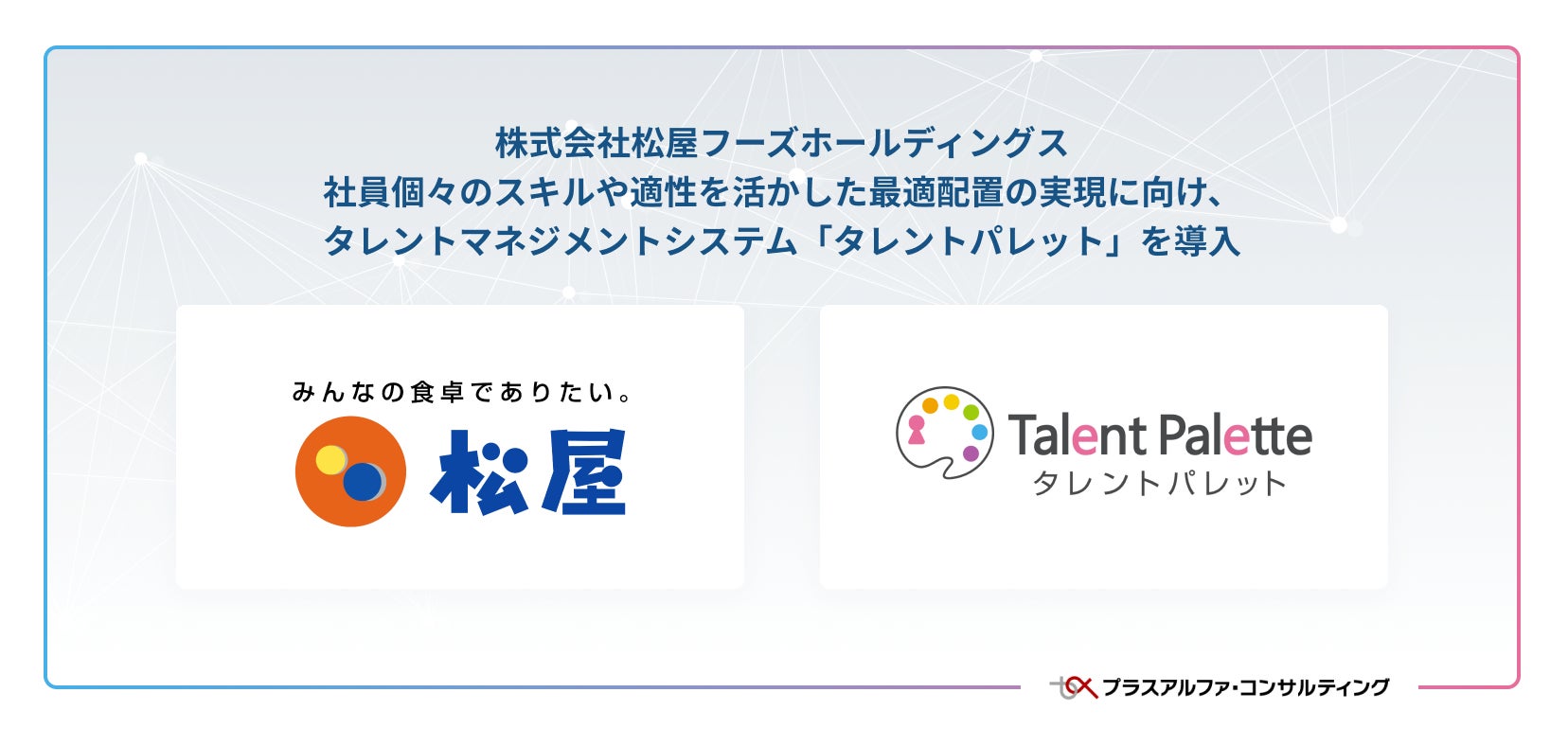 株式会社プラスアルファ・コンサルティング(本社:東京都港区、代表取締役社長:三室克哉 証券コード:4071)は、科学的な人材活用や人的資本の開示、人事業務のDX化、リスキリングの推進などを背景に、多くの大手企業で導入が進んでいるタレントマネジメントシステム「Talent Palette(以下:タレントパレット)」を、株式会社松屋フーズホールディングス(本社:東京都武蔵野市、代表取締役社長 瓦葺 一利 以下「松屋フーズホールディングス」)に導入いただきましたことをお知らせします。