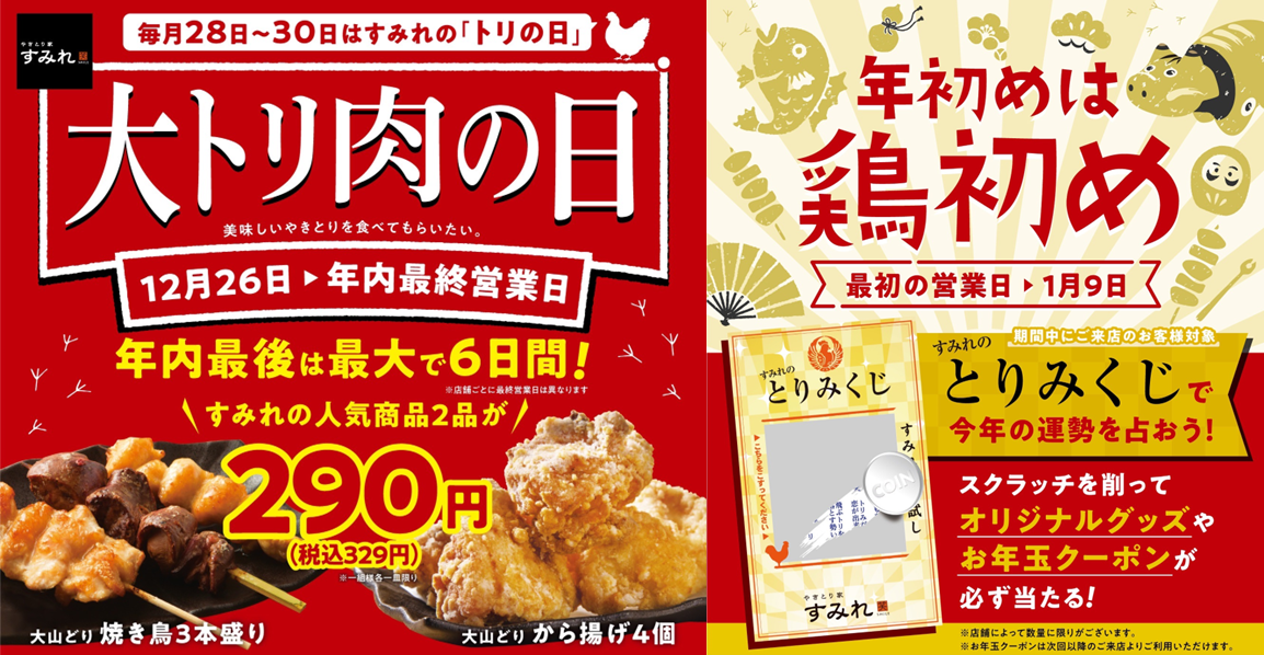 また、年明けにはオリジナルグッズや次回使えるお年玉クーポンが必ず当たる「とりみくじ」を全店舗にて配布します。2022年外食の締めくくりとして、気軽に焼き鳥専門店の料理を楽しんで頂き元気になっていただきたいと企画いたしました。「2022年の鶏納め」も「2023年の鶏初め」もやきとり家すみれで「笑顔の外食」をお楽しみください。