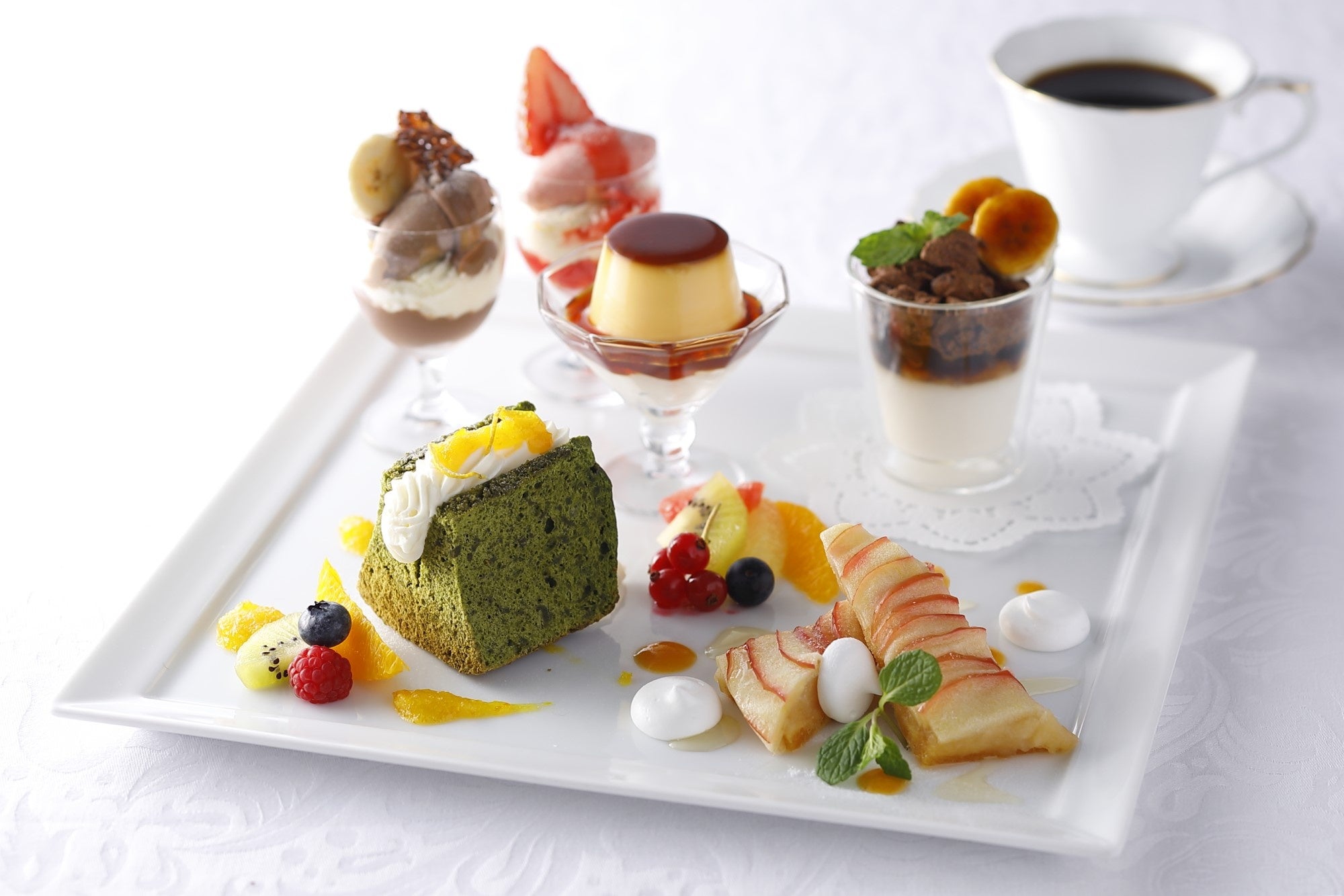 柚子香るジャムと抹茶のシフォンケーキ、薄くカットして焼き上げたりんごがのったキャラメルケーキに、はちみつのサワークリームを添えて。冷凍したチョコレートフレークや焼きバナナをトッピングしたバナナプリンのほか様々なフルーツも盛り付けられ、資生堂パーラー定番のパフェやプリンもプティサイズでお楽しみいただけるワンプレートのデザートです。※2022年12月30日(金)〜 2023年1月 9日(月)の期間は提供を休止させていただきます。