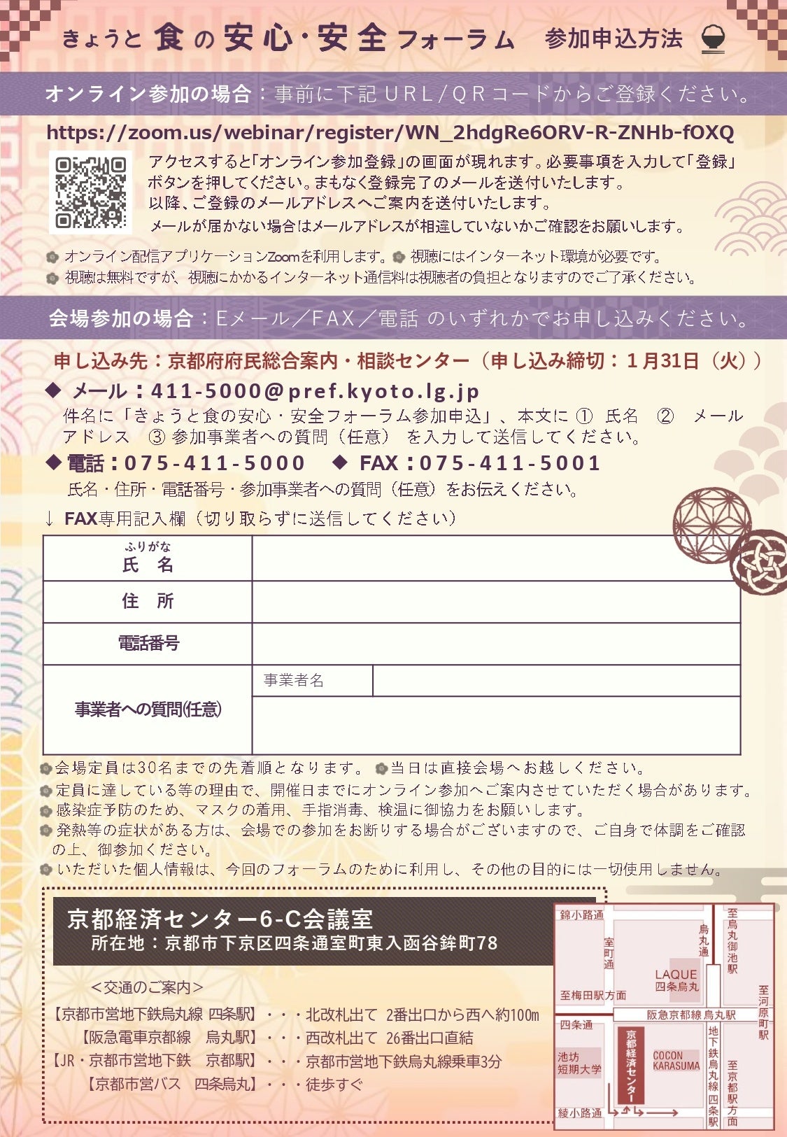 京都府では、府内の食品関連事業者と消費者との交流による「食の信頼づくり」を推進するため、きょうと食の安心・安全フォーラムを2月7日(火)に開催します。参加者募集は1月 31 日(火)まで。(先着順。対面 30 名、オンライン 100 名)是非ご参加ください。