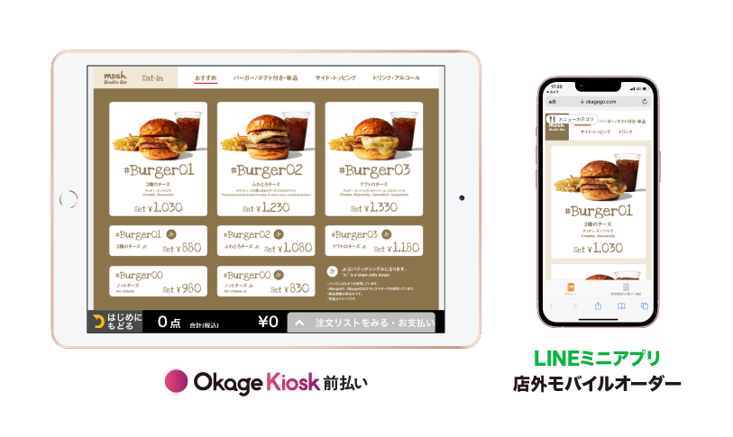 この度、Okage Kiosk前払いとLINEミニアプリ店外モバイルオーダーが採用されました。どちらのサービスも特許取得のフリーレイアウトの注文画面で、新業態のチーズバーガー専門店というこだわりある商品の魅力を引き立てるデザインを実現しています。