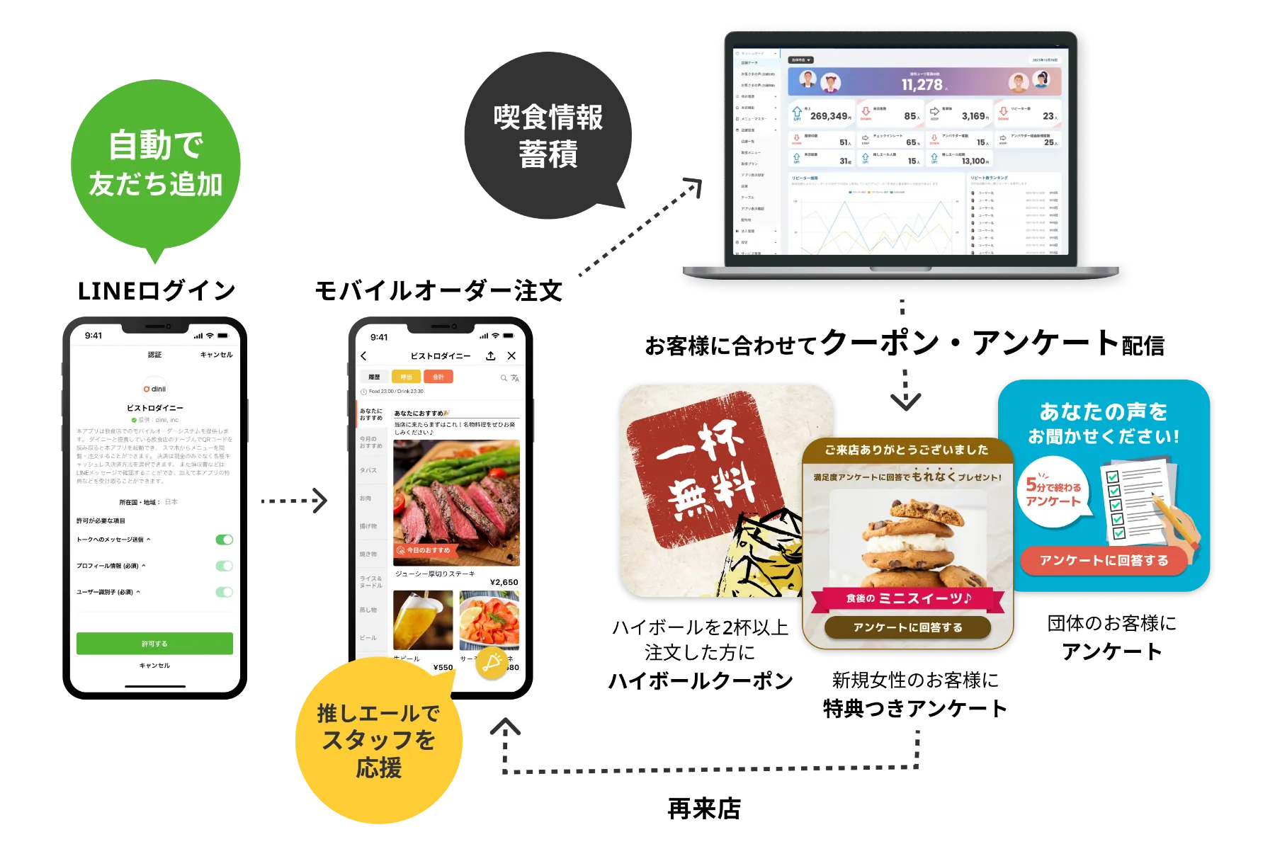 ダイニーは、モバイルオーダーの特徴であるオーダーテイク業務の効率化に加えリピーターを増やせる唯一のモバイルオーダーとして、All in One SaaSダイニーを提供しております。