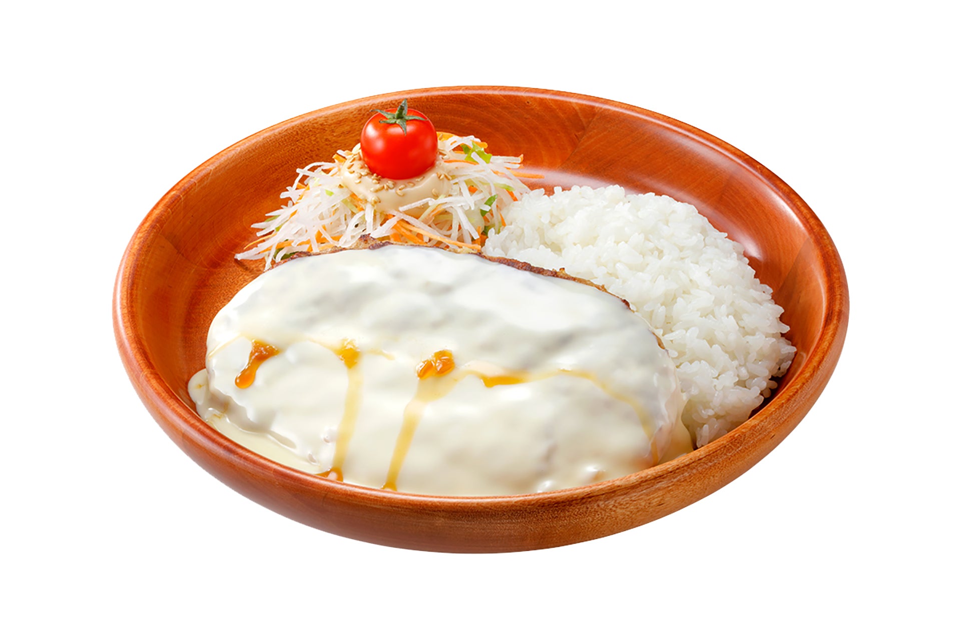 半熟に仕上げた目玉焼きと和風ベースのオリジナルハンバーグソースは抜群の組み合わせ!とろ~りたまごをたっぷりからめてお召し上がりください。