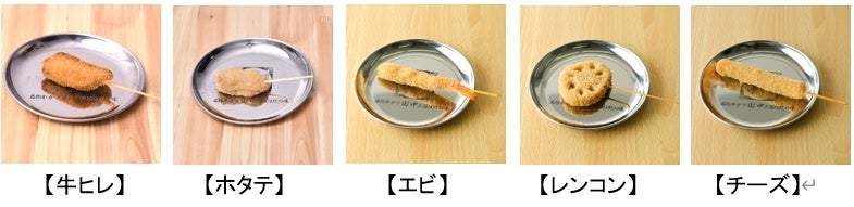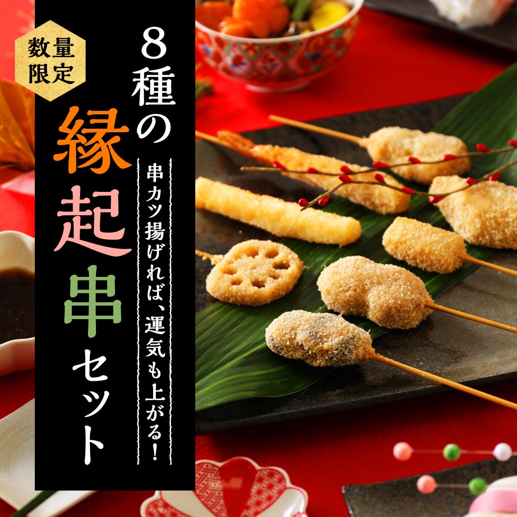 『縁起串セット』串カツ8種類(真鯛※・黒煮豆※・もち※・牛ヒレ・チーズ・エビ・レンコン・ホタテ)