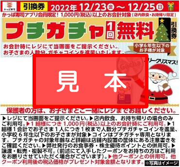 ・内容:店内飲食1,000円(税込)以上ご利用いただき、レジでかっぱ寿司公式アプリ内の「バーコード付引換券」をご提示いただいたお客様、1組様1会計でお子さま一人につき1枚まで、人数分のプチガチャコインを贈呈いたします。