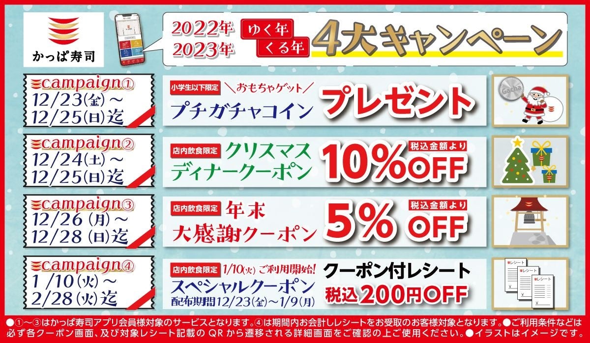 コロワイドグループのかっぱ寿司(カッパ・クリエイト㈱ 本社:神奈川県横浜市)は、2022年のご愛顧に感謝を込めて、「ゆく年くる年4大キャンペーン」を実施いたします。