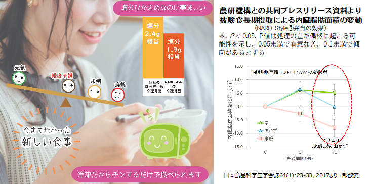 2. 「NARO Style®弁当」においては、生活習慣病予防効果のヒト介入試験の結果、12週間平日の昼間に継続して食べることで、内臓脂肪面積が平均9.2㎠減少することが報告されています。