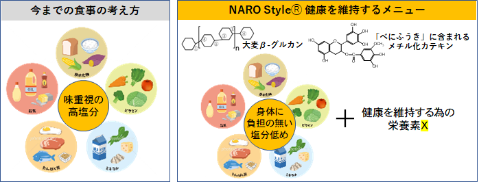 ・ 「健康置き食」で提供する、「NARO StyleⓇ PLUS」は健康を維持するための食事です。