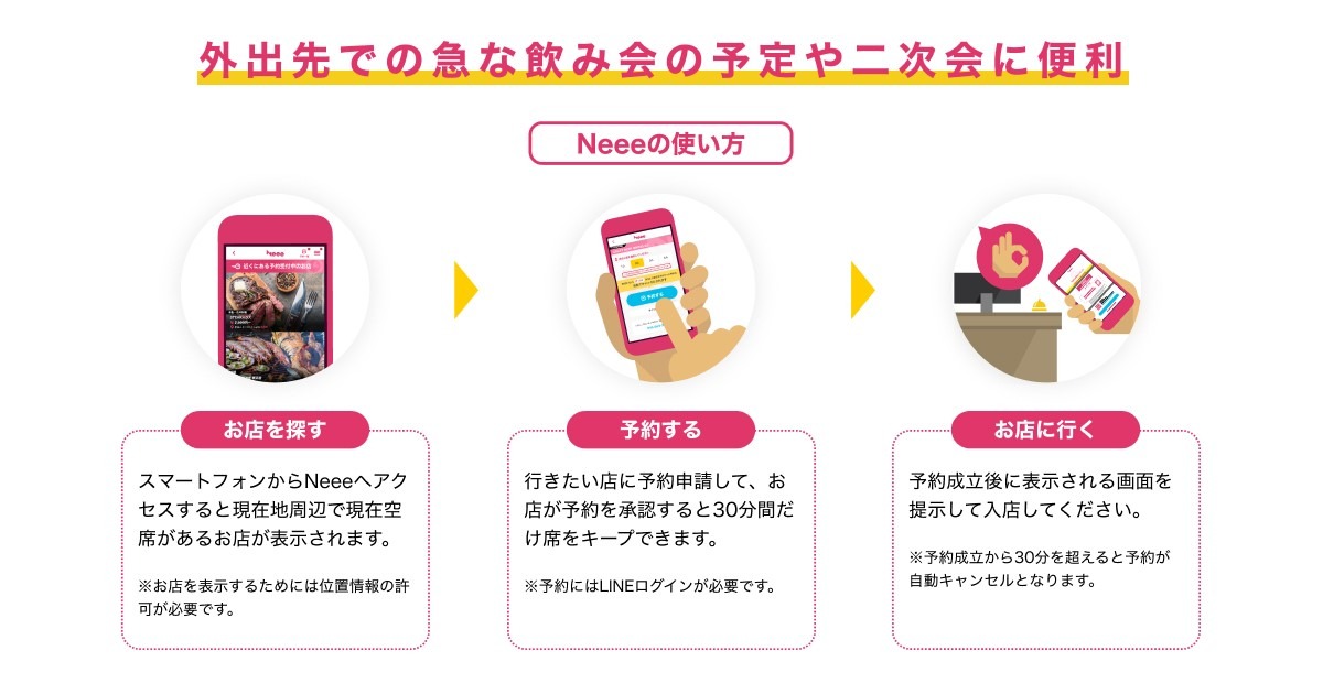 「Neee」は、近くにある今すぐ入れる飲食店を探しているお客様と、当日の空席を埋めたい飲食店をリアルタイムにマッチングするサービスです。来店されるお客様向けに現在予約受付中で近くにある飲食店のみをウェブサイトで紹介し、予約ができるサービスを提供しています。現在は、横浜・関内、馬車道、日本大通りエリアでサービスを提供しています。
