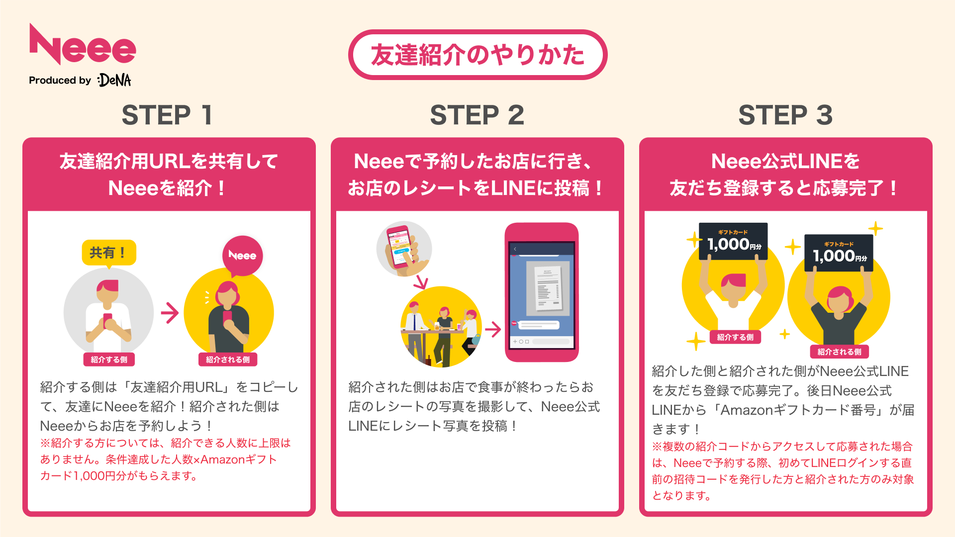 「Neee」で紹介コードを発行し、SNS等で友達にシェアのうえ、友達が「Neee」で予約&レシートをLINEに投稿すると、紹介した方と紹介された方の双方にAmazonギフトカード1,000円分をプレゼントするキャンペーンを実施します。