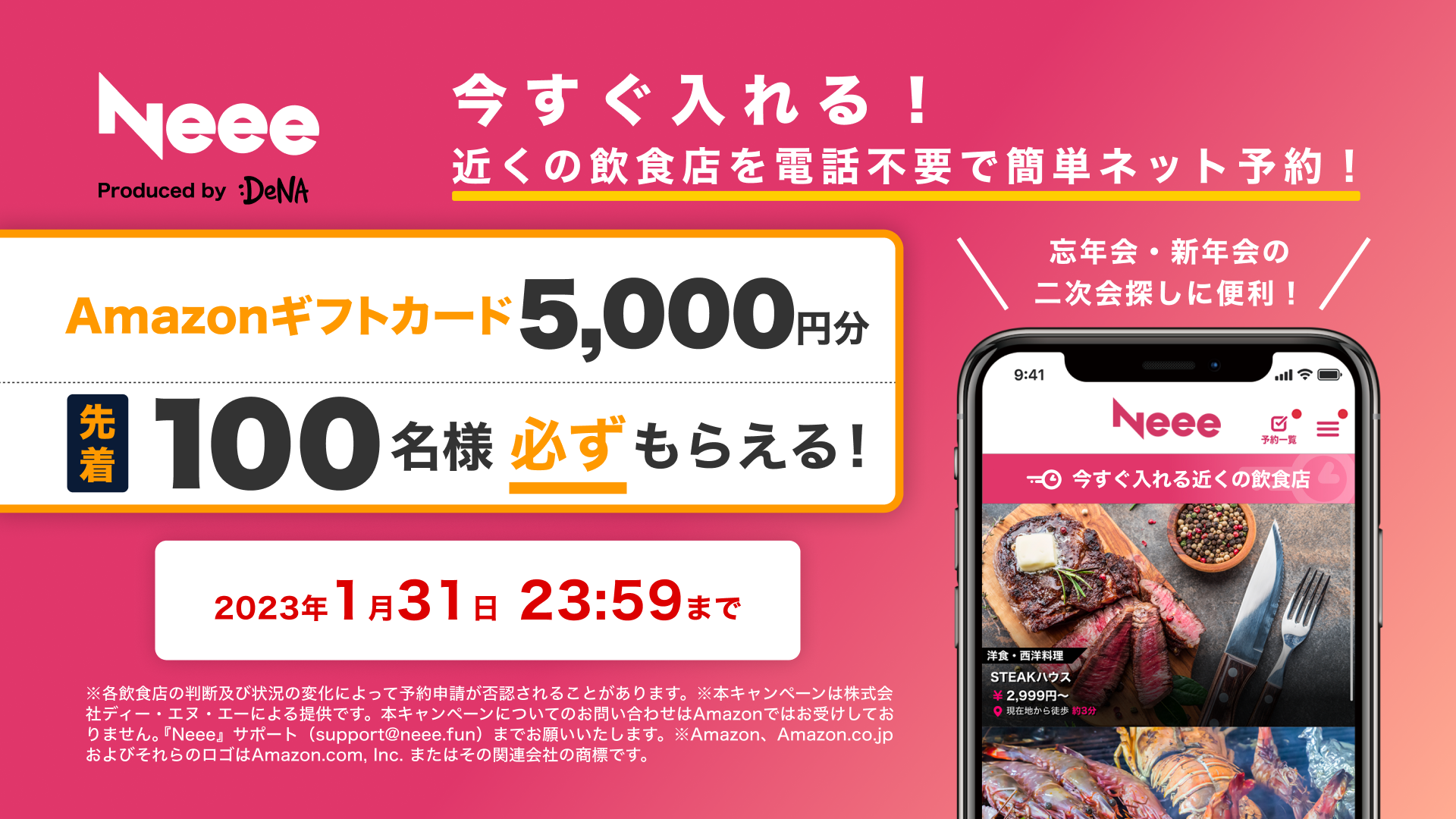 株式会社ディー・エヌ・エー(本社:東京都渋谷区、代表取締役社長兼CEO:岡村 信悟)が提供する、近くにある今すぐ入れる飲食店を予約することができるサービス「Neee(ニー)」は、先着100名様がAmazonギフトカード5,000円分が必ずもらえる、忘年会&新年会応援キャンペーンを開催します。