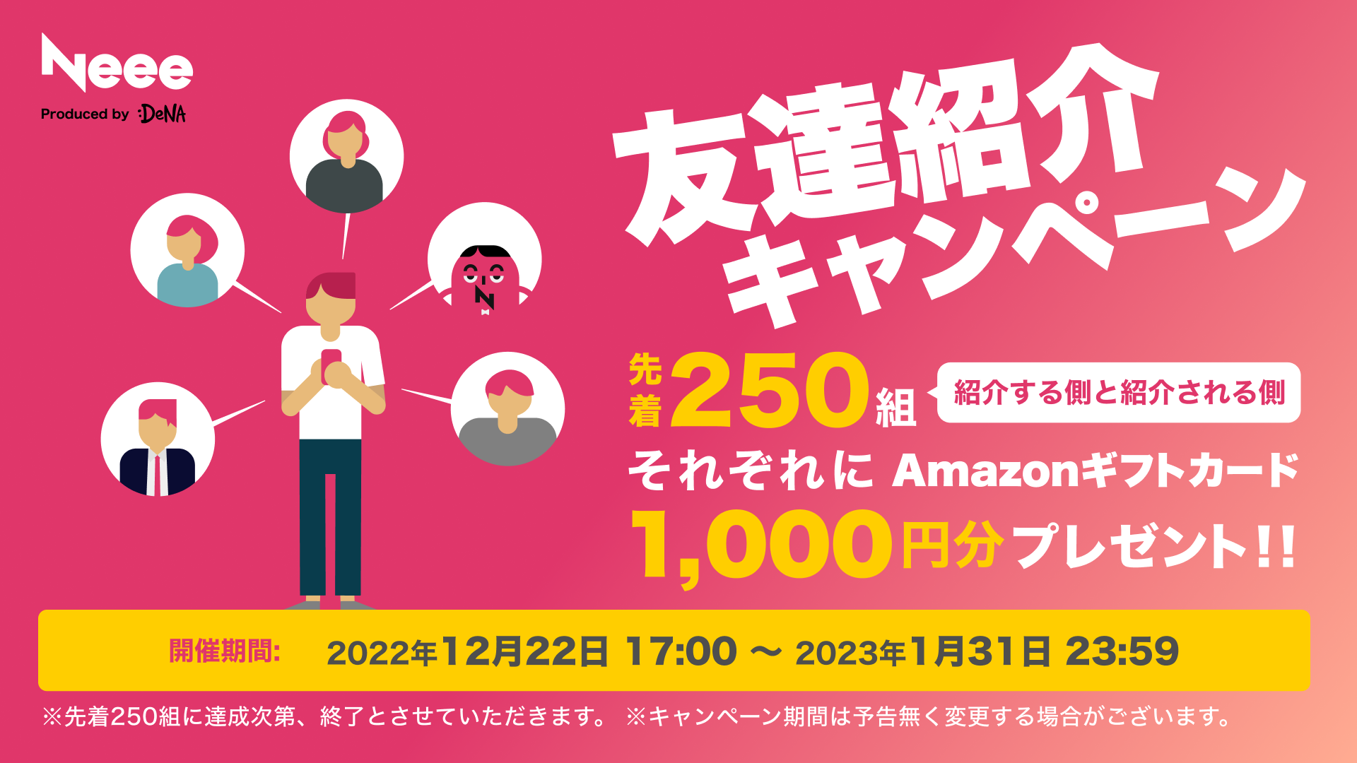 ・本キャンペーンは株式会社ディー・エヌ・エーによる提供です。 本キャンペーンについてのお問い合わせはAmazonではお受けしておりません。 「Neee」サポート(support@neee.fun)までお願いいたします。