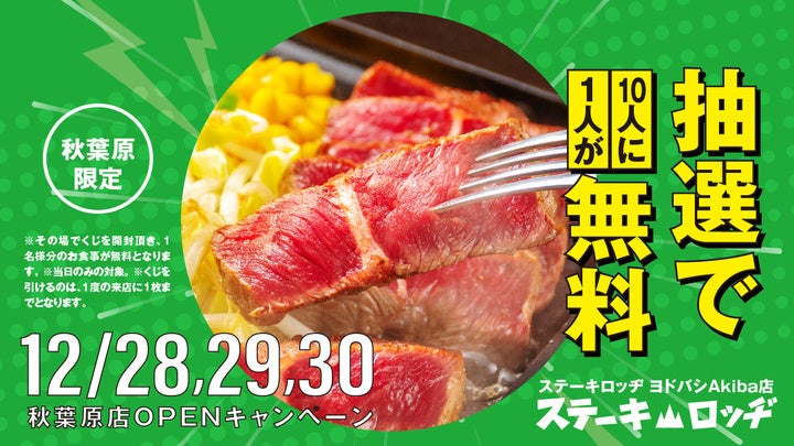 『ステーキロッヂ ヨドバシAkiba店』オープンを記念し、12月28日(水)〜30日(金)の3日間は特別キャンペーンを実施いたします。期間中にご来店の方は、お会計時のくじ引きで当たりが出たら飲食代金が無料に!10人に1人が無料になる高確率設定でお待ちしています。美味しいステーキで、今年最後の運試しをしてみてはいかがでしょう!