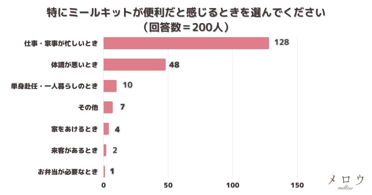 「特にミールキットが便利だと感じるときを選んでください」とアンケート調査した結果、1位は『仕事・家事が忙しいとき』でした。