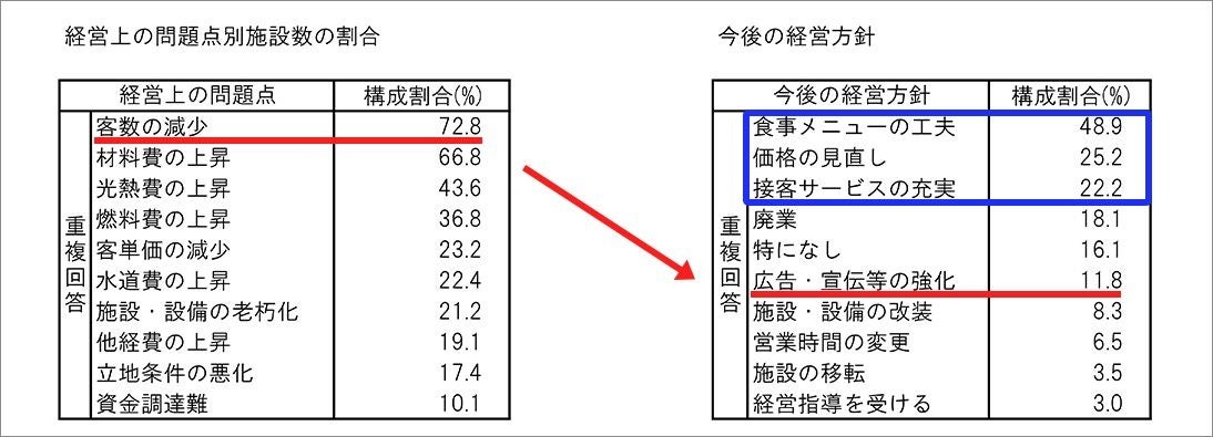厚生労働省の調べによると、飲食店の経営者の多くは、客数の減少に対し、メニューや価格の見直しで解決しようとしている(図1参照)。