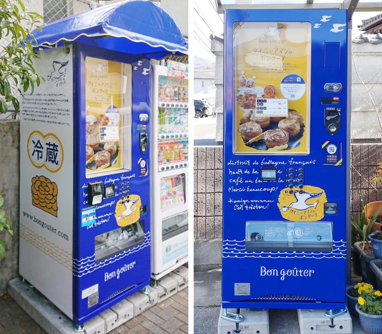 自販機のラッピングは、ボン・グーテ様のイメージカラーに合わせた色合いとなっております。こだわった点は自販機前面の商品棚の部分です。商品棚全面をPOPで覆いクイニーアマンの商品説明と写真、そしてクイニーアマンの食品サンプルを配置することにより、購入されるお客様はイメージしやすくなっております。