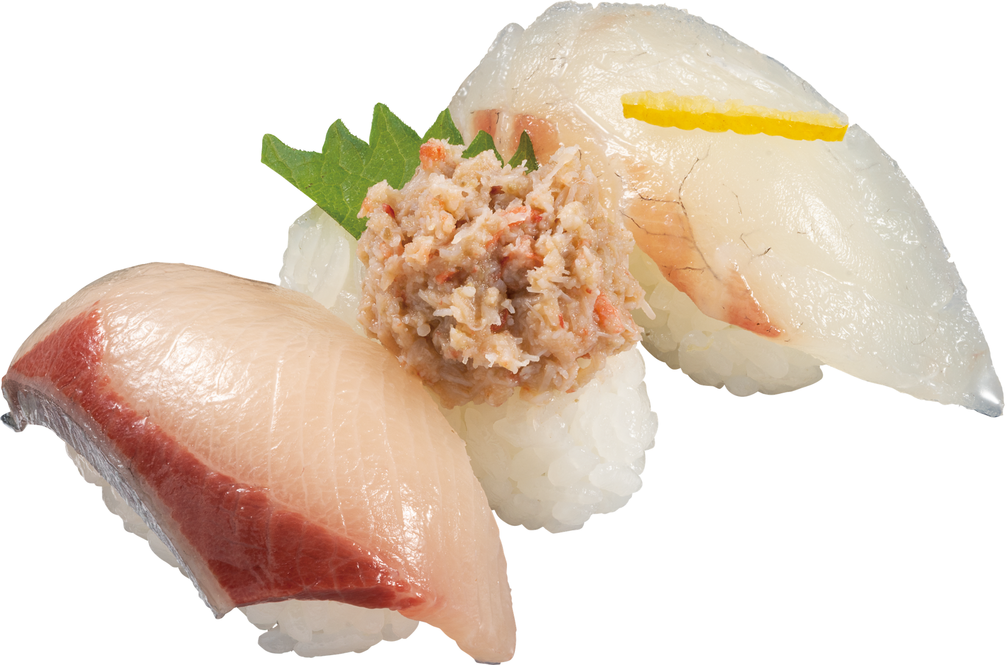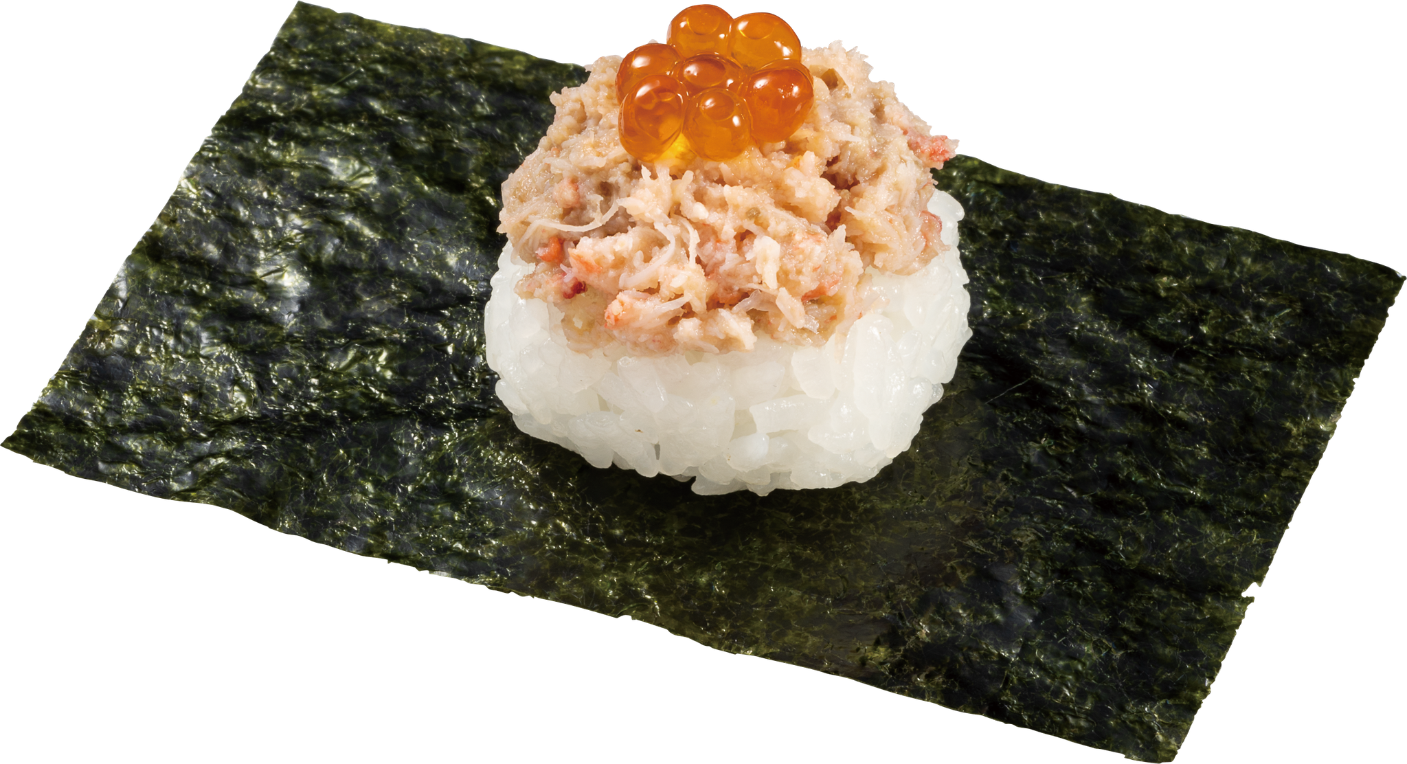 蟹のほぐし身、棒肉、蟹味噌、3種類の「蟹」を活かした、かっぱ寿司オリジナルの「押し寿司」です。