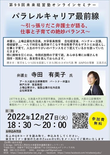 エシカルな消費スタイルを創造する株式会社ロスゼロ(大阪市西区)の代表・文美月は、自身が理事を務めるNPO法人同志社大学産官学連携支援ネットワーク(以下:D-BRIDGE)が主催する「未来経営塾」に、弁護士の寺田有美子氏を講師にお招きします。母親であり弁護士・社外役員・大学客員教授等マルチに活躍する寺田氏が仕事や子育てのバランスをどう捉えているのかを文美月が伺います。
