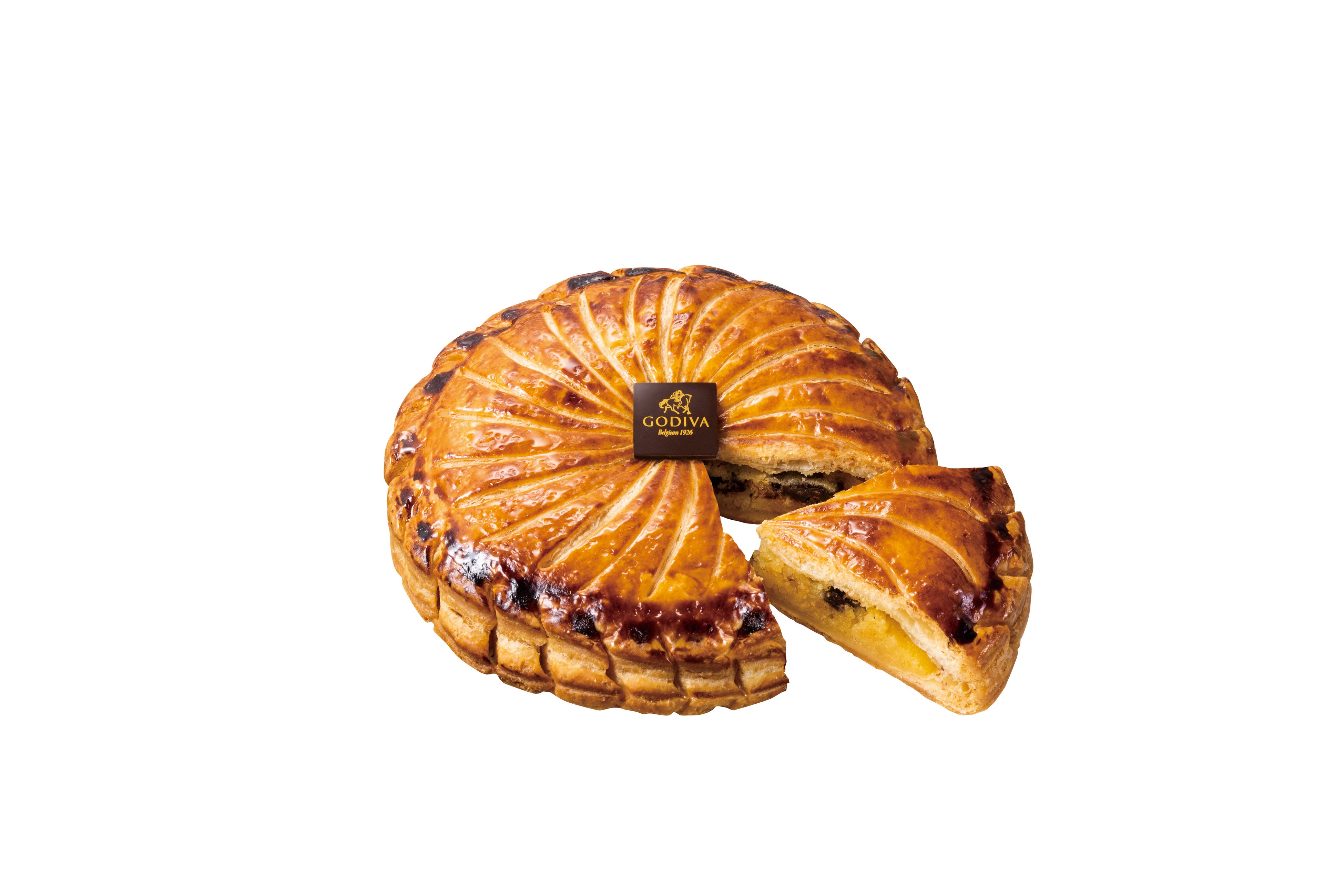 伝統的なガレットデロワに使用されるパイ生地「フィユタージュアンヴェルセ」を使用し、ベルギー産のチョコレートチップをフィリングに混ぜ込んでじっくりと焼き上げました。バターの芳醇な香りとチョコレートの風味が香るゴディバのガレットデロワです。