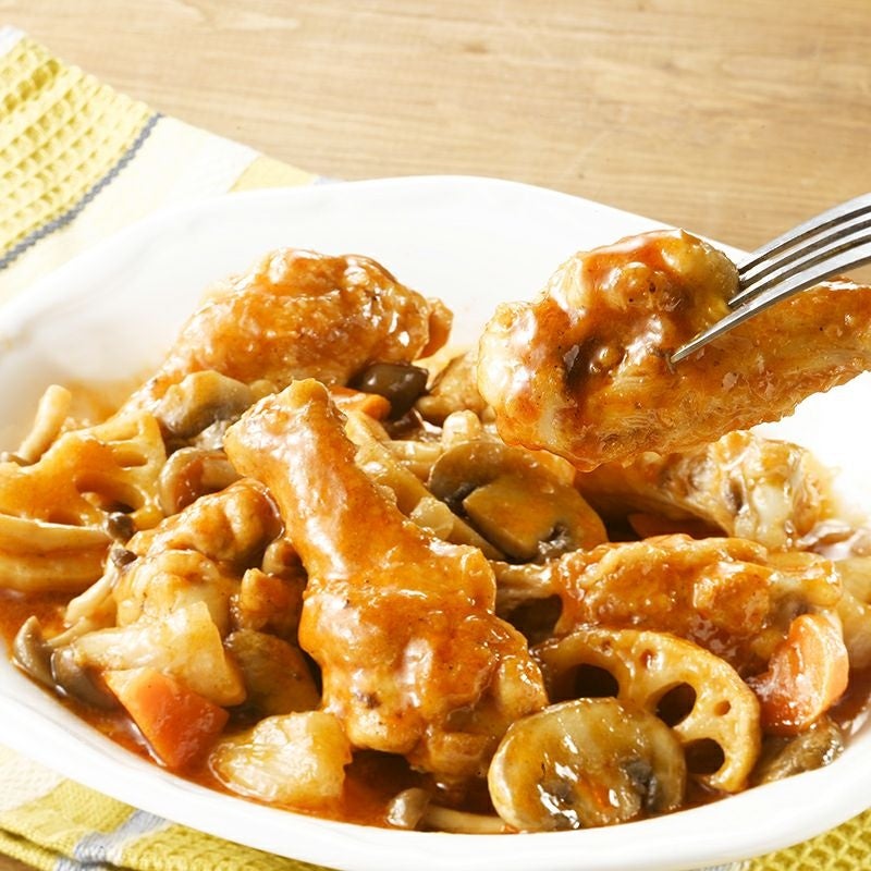 手羽元にきのこと根菜を加えた、旨みたっぷりのボリュームのあるトマト煮込みです。