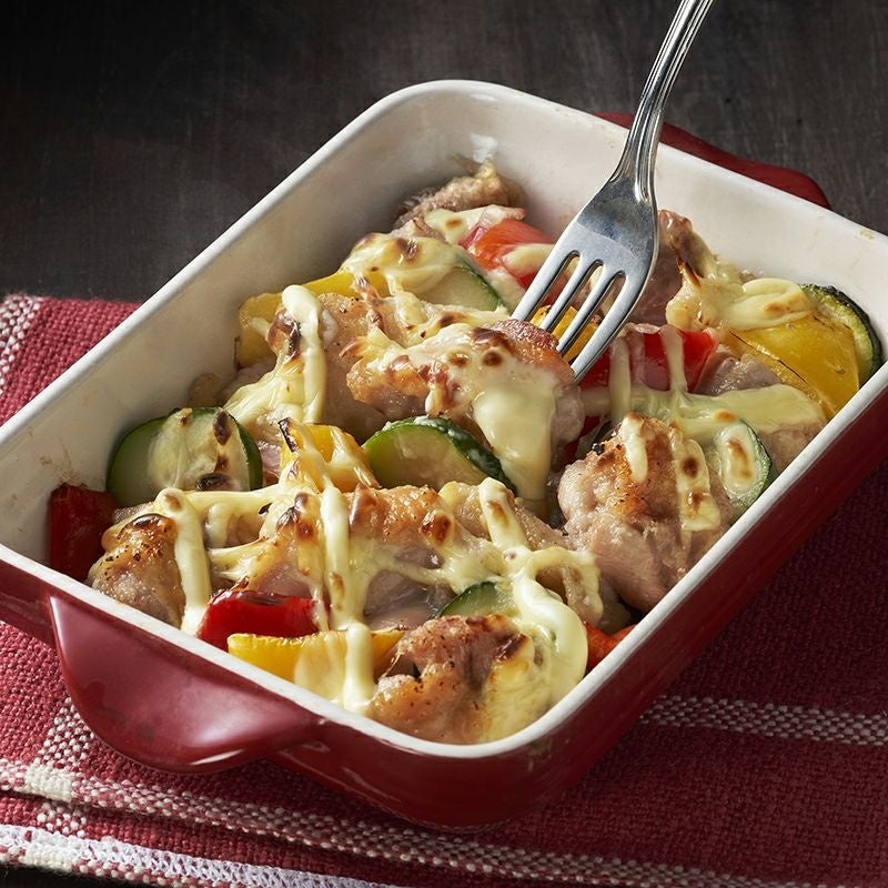 みつせ鶏のジューシーなもも肉と彩野菜にチーズソースをかけ、オーブンで焼くだけの簡単調理