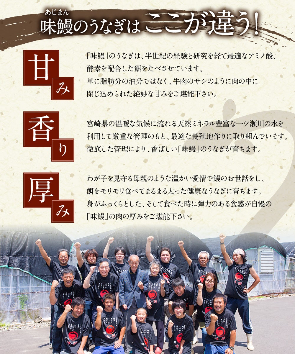 中村養鰻場オリジナルブランド「味鰻(あじまん)」は、手塩に掛けて育てた自慢のうなぎを、しっかりと弾力のある肉厚な蒲焼きに仕上げました。