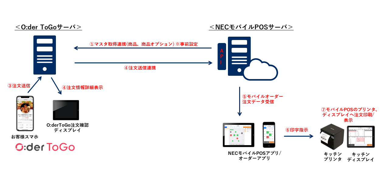 今回の連携により、飲食店はモバイルオーダーサービス「O:der ToGo(オーダートゥーゴー)」で入力された注文情報をNECモバイルPOSに取り込み、注文情報の一元管理と会計処理ができるようになりました。