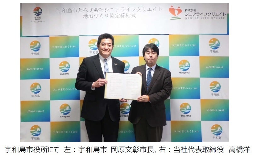 高齢者専門宅配弁当サービスを展開する株式会社シニアライフクリエイト(本社:東京都港区、代表取締役:高橋洋)は、高齢者等が住み慣れた地域で安心して暮らし続けられる地域共生社会の実現を目指して、愛媛県宇和島市と「市と事業者との連携による市民を支える地域づくり協定」を2022年12月23日(金)に締結いたしました。
