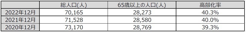 宇和島市が公表する人口推移※1によると、2020年から2022年にかけて総人口・65歳以上の高齢者人口が減少している一方、高齢化率は上昇しています。宇和島市では、高齢者等が住み慣れた地域でいつまでも安心して暮らし続けられる地域共生社会の実現を目指して、民間企業と連携して住民支援を行うことによる、市民を支える地域づくりを推進しています。