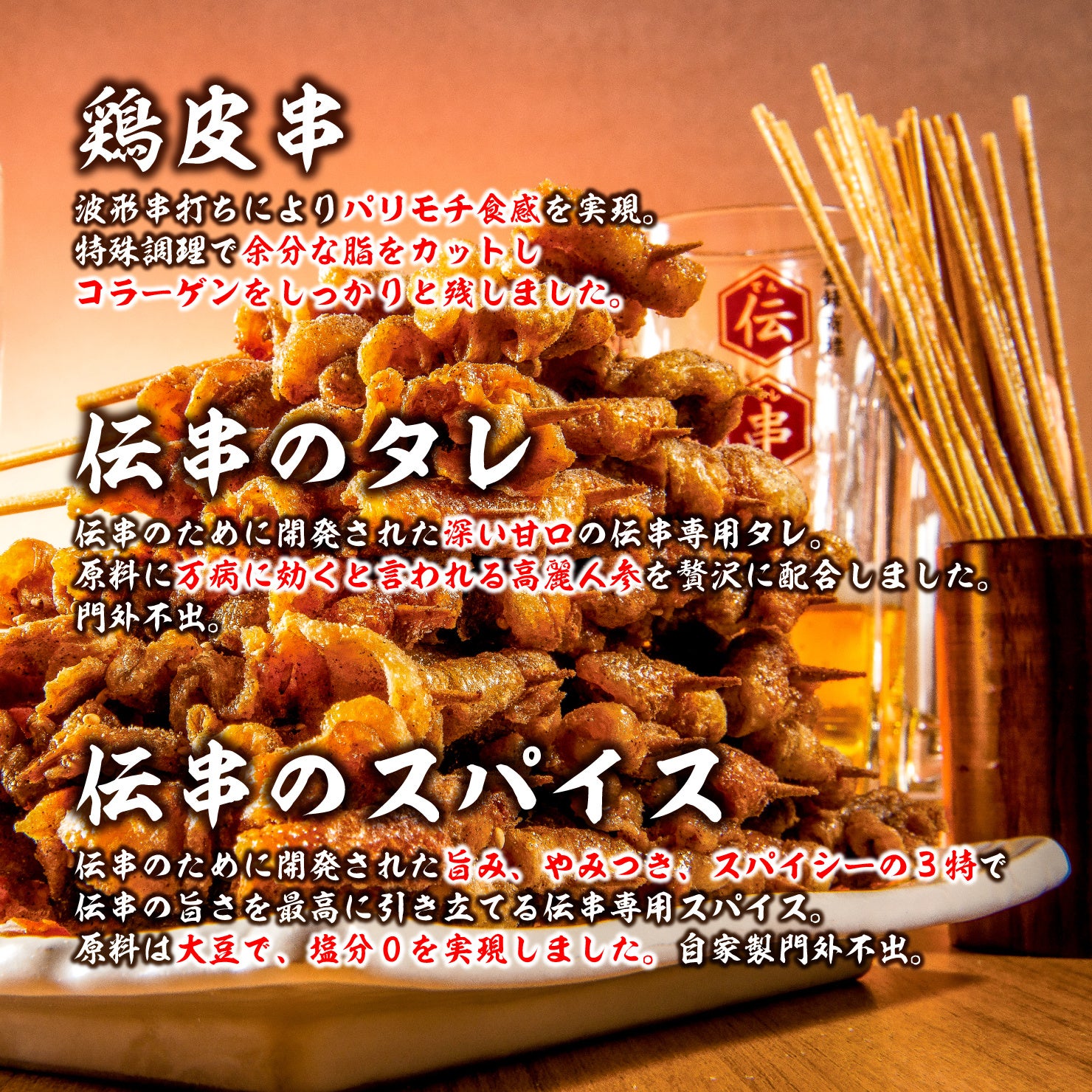 伝串は、独自の波型串打ちにより“パリもち食感”を実現。調理工程で、余分な脂を落とした鶏皮はコラーゲンの宝庫。表面はパリパリ、中はモチモチとなり、何本でも美味しく食べられます。タレには万病に効くといわれる高麗人参を使用。甘口で美味しい自家製高麗人参タレと伝串の相性抜群です。