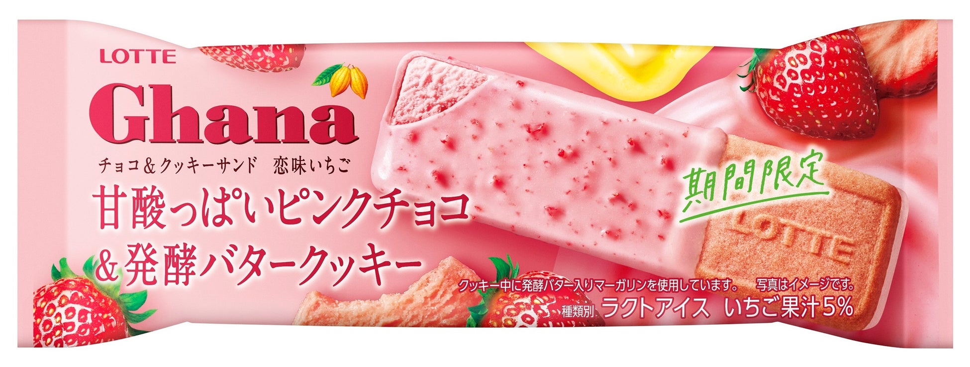 株式会社ロッテは1月2日(月)に、くちどけなめらかなチョコレート「ガーナ」ブランドから、アイスの商品『ガーナチョコ&クッキーサンド 恋味いちご』を発売します。ピンク色の発酵バタークッキーといちごチップ入りチョコ、いちごアイスの味わいがしっかりと楽しめます。パッケージはいちごをあしらったピンク色が映えるデザインで、いちごの季節をかわいらしく演出します。この時期だけの味わいをぜひお楽しみください!