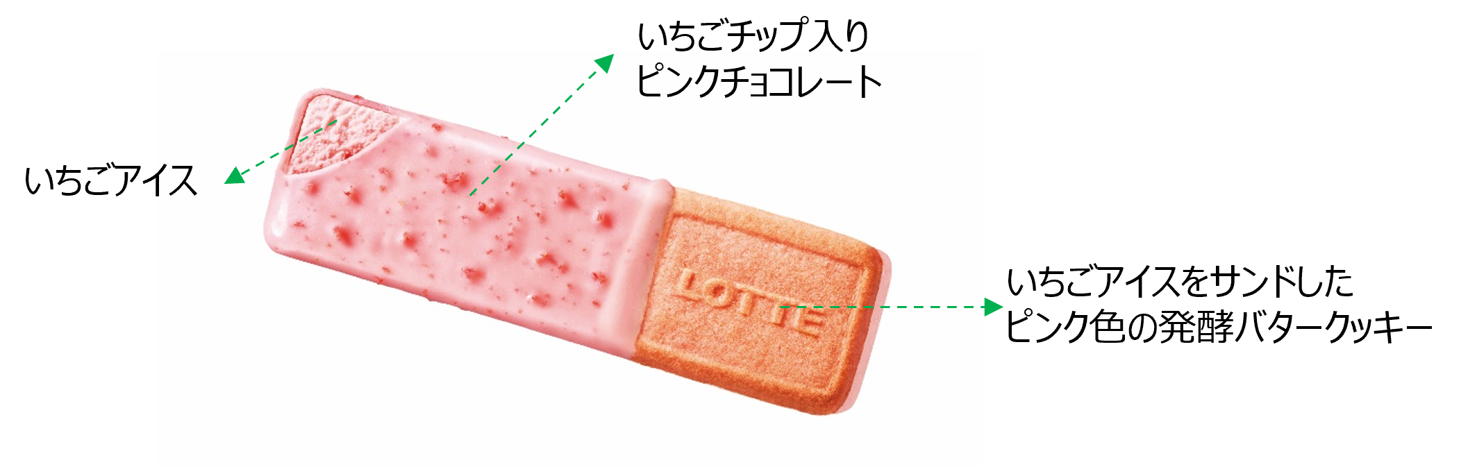 - いちごチップ入りの甘酸っぱいチョコのおいしさと、ピンク色の発酵バタークッキーでサンドしたいちごアイスのおいしさが1つで楽しめる欲張りなアイスです。