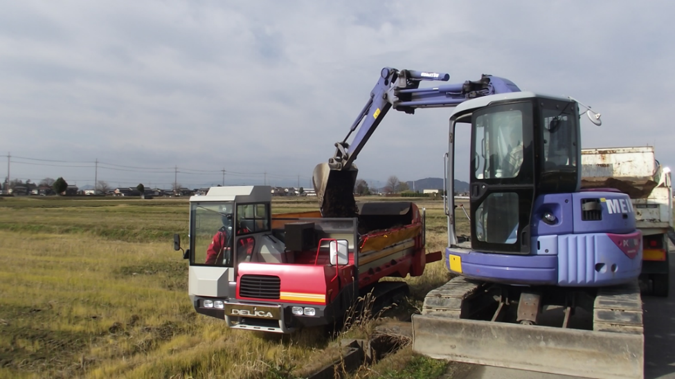 大型の農業機械でバイオ炭を散布する。(画像提供:甲良集落営農連合協同組合)
