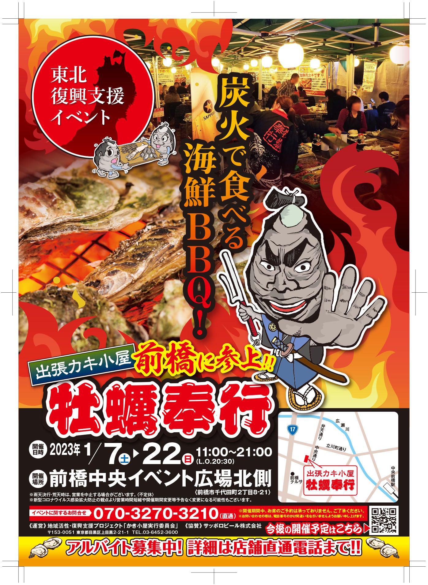宮城県石巻の牡蠣をセルフ炭火焼き(海鮮BBQ)で楽しむ「出張カキ小屋 牡蠣(かき)奉行」(TEL 070-3270-3210)が前橋中央イベント広場(群馬県前橋市)に期間限定オープン。期間は1月7日〜1月22日