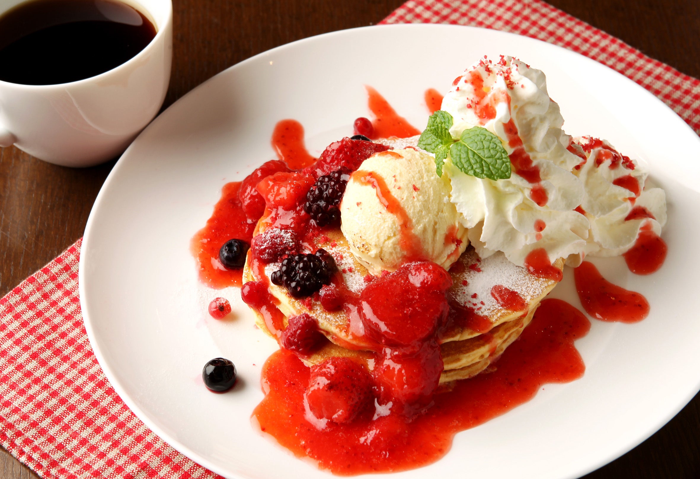 3種のベリー「ラズベリー・ブルーベリー・ブラックベリー」を散りばめた色鮮やかなパンケーキはふわふわ生地のほんのり甘いパンケーキに、たっぷりのホイップクリームとバニラアイスを添え、トリプルベリーの香りとお店で仕 込んだ甘酸っぱいストロベリーソースで爽やかに仕上げました。
